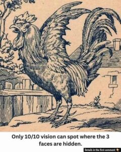 Many tend to focus only on the primary subject (the rooster) and miss the subtle faces integrated into its features.