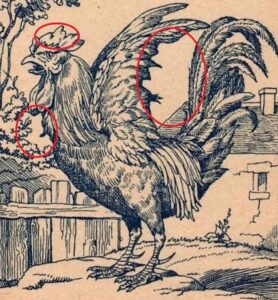 Face 3: An inverted face created by the arrangement of the roosterโs wing and tail.